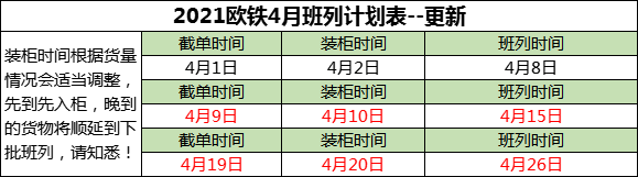 由于5.1假期的影響,我司歐鐵荷郵小包渠道2021年4月份班列截開時間安排更新如下表(截單時間表示當天到的貨會處理),請廣大客戶知悉,謝謝!