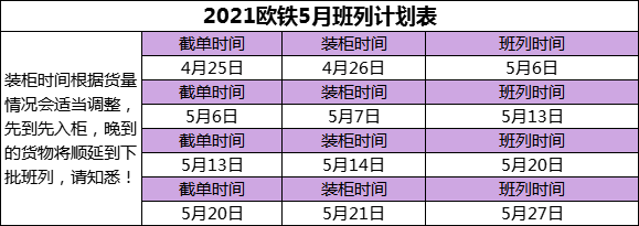 關于我司歐鐵荷郵小包渠道2021年5月份班列截開時間安排如下表(截單時間表示當天到的貨會處理),我司走的是圖定班列,每周班列發車時間有保證,時效穩定,到達荷郵提取時效是裝柜后28-30天。請廣大客戶知悉,謝謝!
