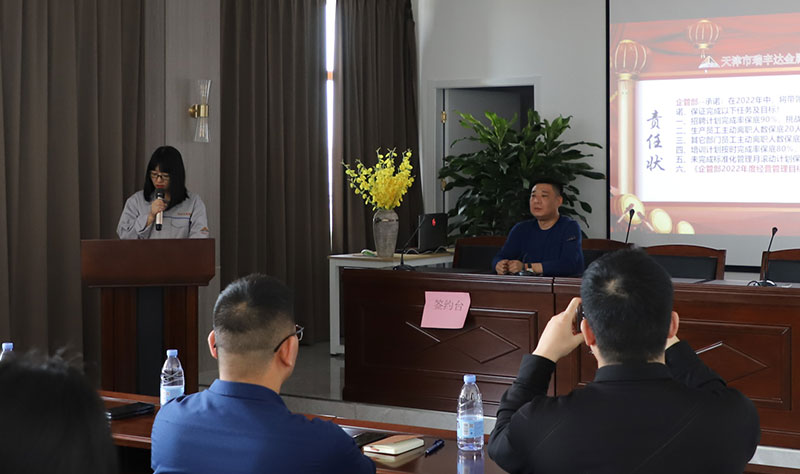 為確保公司發展戰略有效落實,全面實現公司2022年度各部門工作目標,強化企業執行力,提升核心競爭力。2月20日,天津市瑞豐達金屬制品有限公司目標責任狀簽約儀式隆重舉行。總經理張加軍、CEO王娟、各部門負責人、中高層管理人員等出席此次會議。