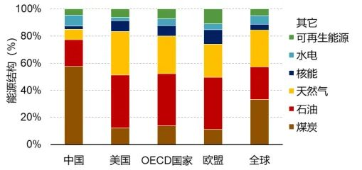 與全球主要經濟體相比,我國重工業比重偏高,能源結構以煤為主,在新能源利用方面,還有很大的上升空間。