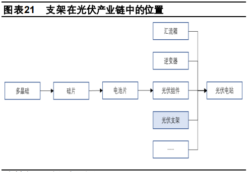 光伏支架可主要分為固定支架及跟蹤支架,固定支架主要包括最佳傾斜角固定式以及固定可調式。跟蹤支架主要包括平單軸、斜單軸和雙軸支架,可使光伏組件全天跟隨太陽位置運動,減小太陽光的入射角度,提高光伏組件對太陽能的吸收率。