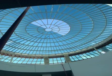 場(chǎng)館由珠江邊開(kāi)始,在北部廣場(chǎng)兩側(cè)設(shè)置騎樓,利用一系列下沉庭院為地下空間提供了安全通道及怡人的景觀、通風(fēng)和采光,所有展廳都圍繞一個(gè)圓形中庭。絕美的外形設(shè)計(jì)也帶來(lái)了世界級(jí)極復(fù)雜的幕墻工程系統(tǒng),碲化鎘薄膜九宮格光伏發(fā)電組件組成的光電幕墻為世界首創(chuàng),立面四周及屋面全建筑光伏組件發(fā)電幕墻屬世界唯一,設(shè)計(jì)使用年限100年,整體幕墻面積7萬(wàn)平方米。