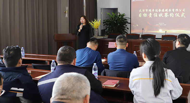 為確保公司發展戰略有效落實,全面實現公司2022年度各部門工作目標,強化企業執行力,提升核心競爭力。2月20日,天津市瑞豐達金屬制品有限公司目標責任狀簽約儀式隆重舉行??偨浝韽埣榆?、CEO王娟、各部門負責人、中高層管理人員等出席此次會議。