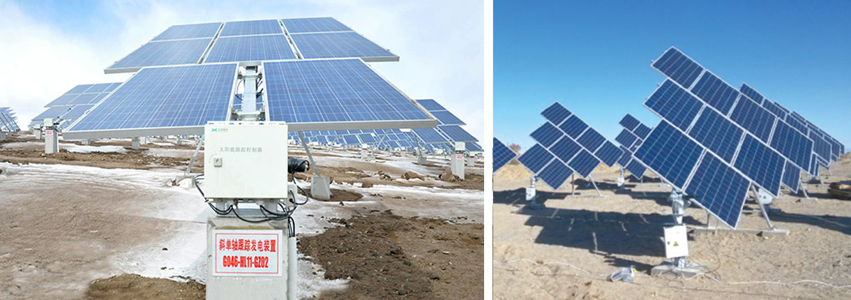 瑞豐達金屬制品斜單軸追蹤式光伏支架,由于平單軸跟蹤的電池板垂直線與太陽光始終有一個夾角,在高緯度地區夾角較大,不比固定傾斜安裝效率高多少。為提高電池板的效率,可將電池板的轉軸傾斜安裝,減小電池板垂直線與太陽光的夾角。